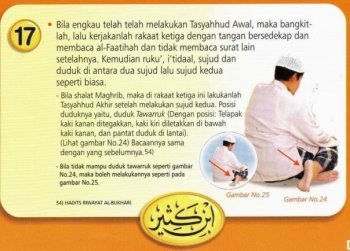 17. • Bila engkau telah melakukan Tasyahhud Awal, maka bangkitlah, lalu kerjakan rakaat ketiga dengan tangan bersedekap dan membaca al-Faatihah dan tidak membaca surat lain setelahnya. Kemudian ruku’, i’tidaal, sujud dan duduk di antara dua sujud lalu sujud kedua seperti biasa.