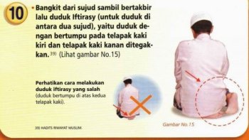 10. • Bangkit dari sujud sambil bertakbir lalu duduk Iftirasy (untuk duduk di antara dua sujud), yaitu duduk dengan bertumpu pada telapak kaki kiri dan telapak kaki kanan ditegakkan. [39]