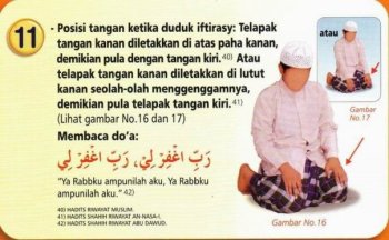 11. – Posisi tangan ketika duduk iftirasy: telapak tangan kanan diletakkan di atas paha kanan, demikian pula dengan tangan kiri.[40] Atau telapak tangan kanan diletakkan di lutut kanan seolah-olah menggenggamnya, demikian pula telapak tangan kiri. [41]