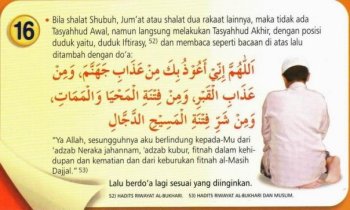 16. • Bila shalat Shubuh, Jum’at atau shalat dua rakaat lainnya, maka tidak ada Tasyahhud Awal, namun langsung melakukan Tasyahhud Akhir, dengan posisi duduk, yaitu duduk Iftirasy, [52] dan membaca seperti bacaan di atas lalu ditambah dengan doa: