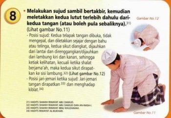 8. • Melakukan sujud sambil bertakbir, kemudian meletakkan kedua lutut terlebih dahulu daripada kedua tangan (atau boleh pula sebaliknya). [31]