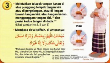 3. Meletakkan telapak tangan kanan di atas punggung telapak tangan kiri, atau di lengan bawah tangan kiri, atau tangan kanan menggenggam tangan kiri, [13] dan posisi kedua tangan di dada.